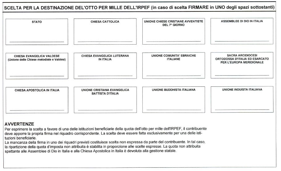 En Italia hay la posibilidad de escoger entre diversas posibilidades (más de una decena) a la hora de financiar a confesiones religiosas, un modelo que defienden para España algunos grupos religiosos. Los grupos financiables en Italia hace unos años (en la actualidad son má numerosos) pueden verse en la siguiente fotografía tomada de un modelo de declaración de renta.